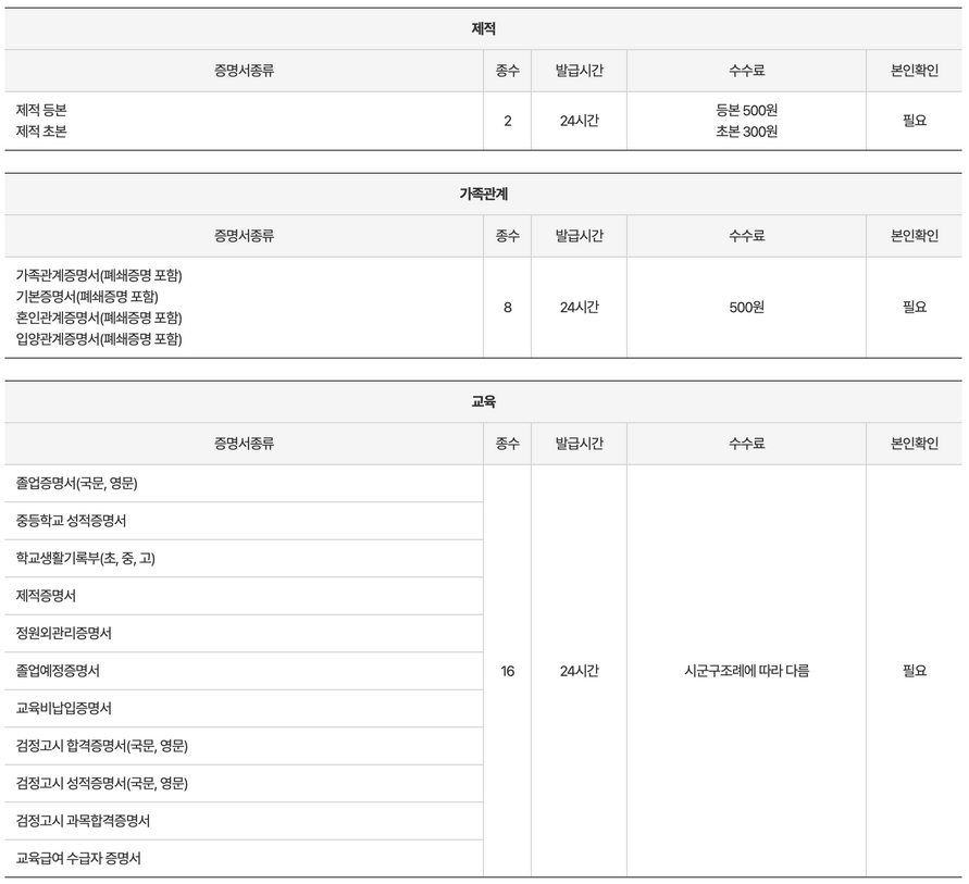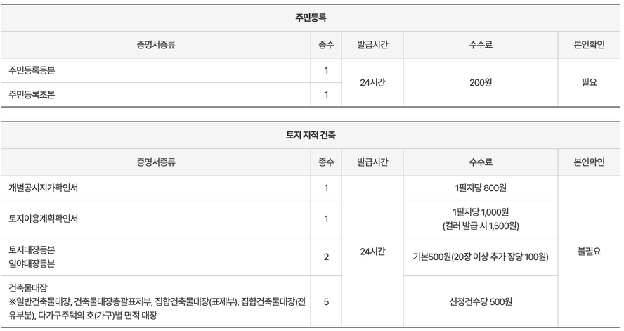 <무인민원발급기 증명서 종류 및 수수료 2>